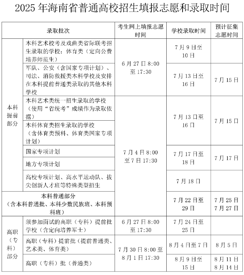 海南2025高考专科志愿投档后,高校需对考生档案进行审核,包括成绩、专业要求、体检信息等,最终确定录取名单。这一过程一般需要3-5个工作日。以下是小编整理的2025年海南高考专科录取时间安排: