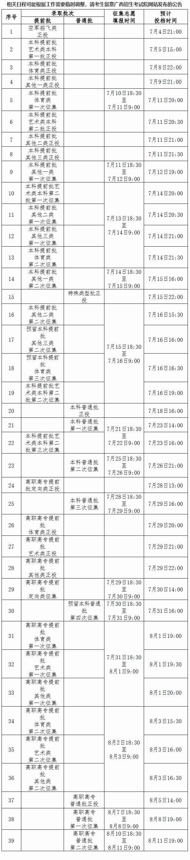 根据2025年广西高考录取安排,不同批次的录取结果公布时间差异较大,具体如下: