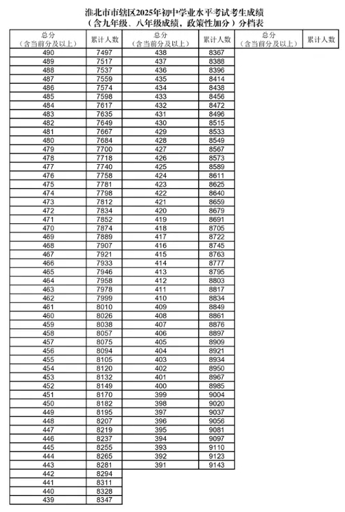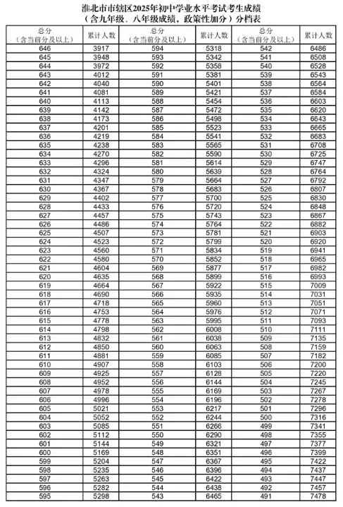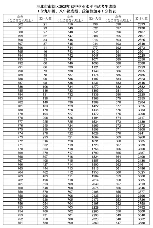 安徽淮北市市辖区2025年中考考生成绩分档表: