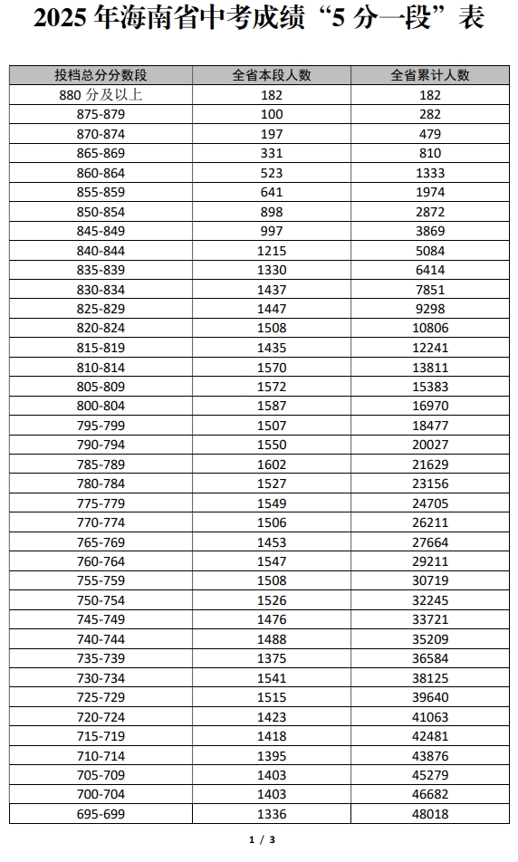 2025年海南省中考成绩“5分一段”表已经公布:880分及以上本段人数182人,累计人数182人;870-874分本段人数100人,累计人数282人;865-869分本段人数331人,累计人数810人等。具体详情如下: