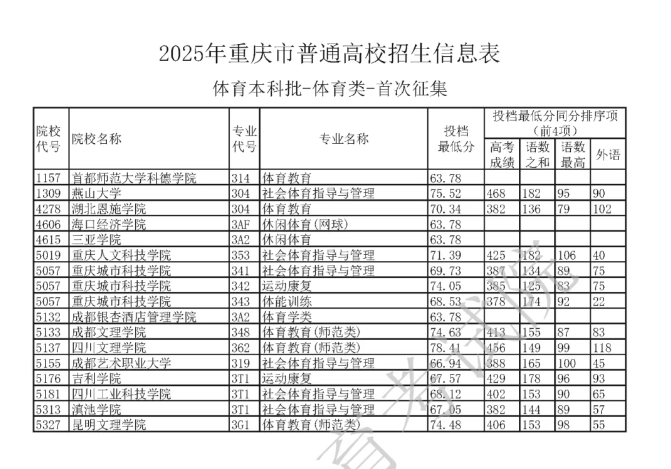 体育类本科批投档最低分是根据考生高考文化课成绩和重庆市专业统考成绩按 “高考文化课成绩 ×30%+ 体育专业统考成绩 ×70%” 的规则合成的综合成绩进行排序确定的,以下是小编整理的2025重庆体育类本科批首次征集志愿投档最低分,具体来看一下!