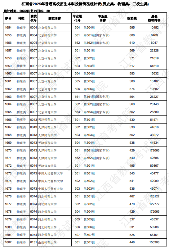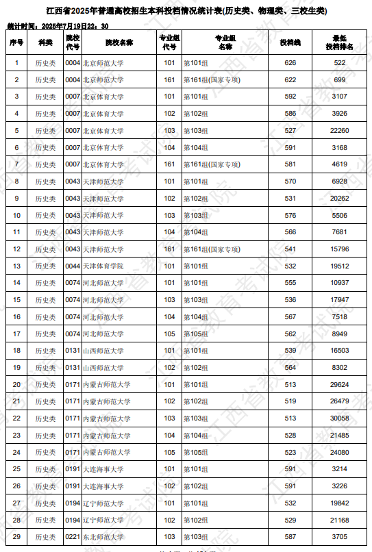 2025年江西高考普通类本科批录取控制分数线为:历史科目组486分,物理科目组429分。与2024年相比,历史组本科线上涨了23分,物理组本科线下降了19分。这一变化可能与今年的考试难度、考生整体表现以及招生计划等因素有关。