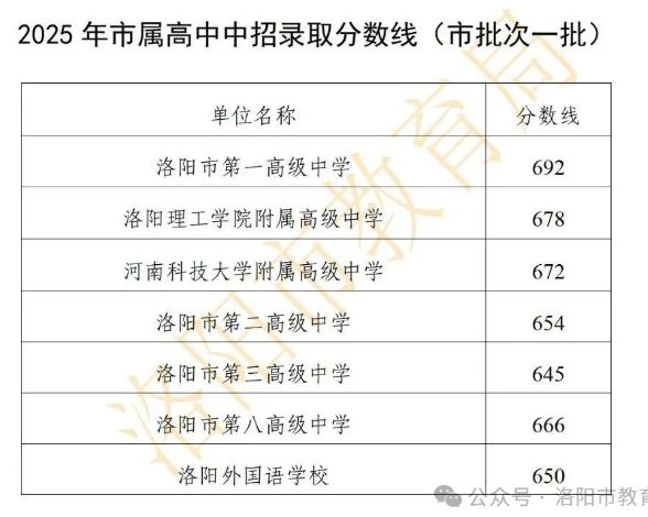从洛阳市教育局了解到,2025年河南洛阳市直高中录取分数线已公布,其中一批次洛阳市第一高级中学分数线为692分;洛阳理工学院附属高级中学分数线为678分。具体详情小编整理如下: