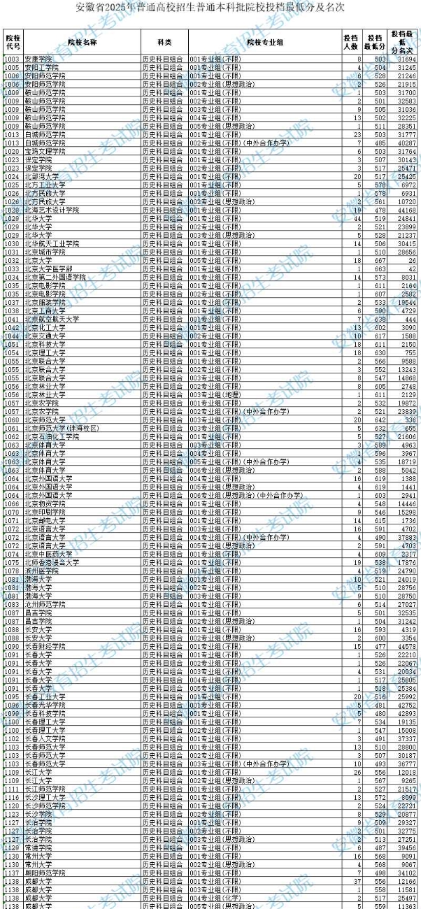 安徽2025年本科批院校投档最低分及名次(历史科目组合)如下: