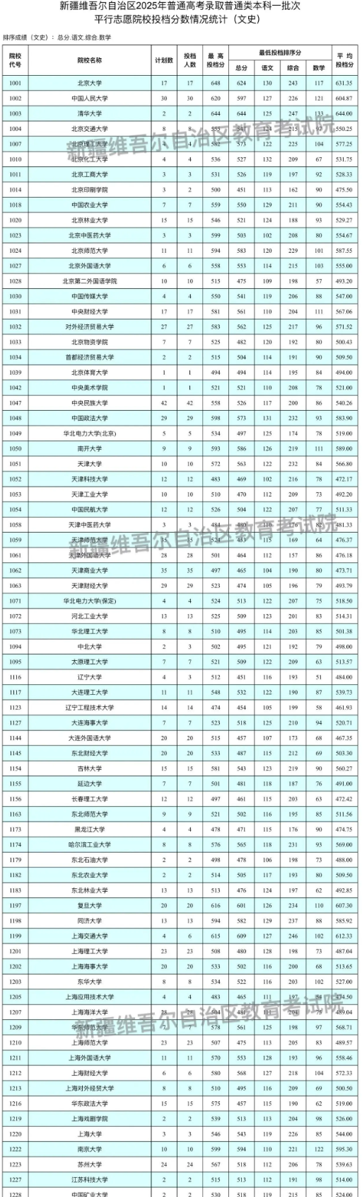 新疆2025高考本科一批文史投档分数线: