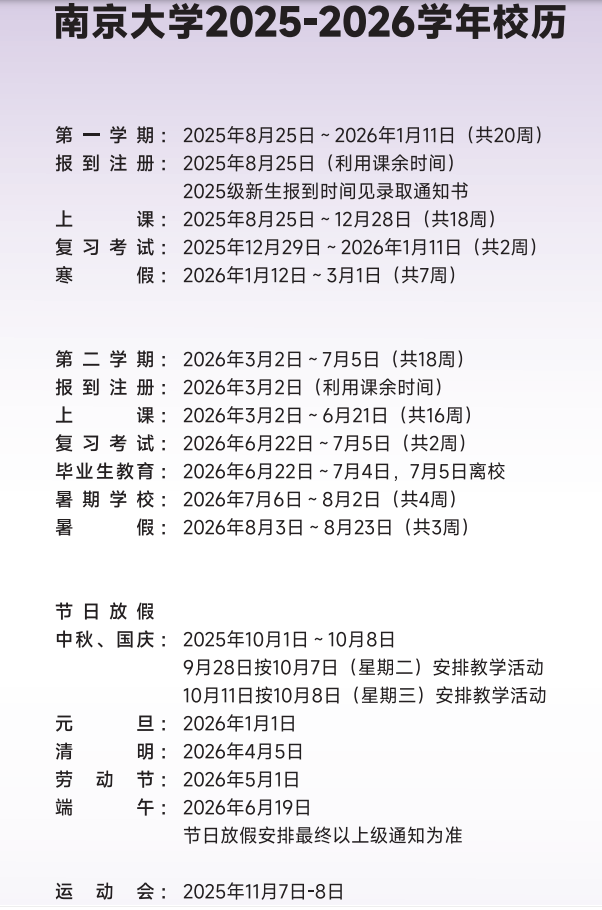 根据官网信息,2025年南京大学南京大学2025级本科新生开学时间未在公开信息中具体公布,需以官方发布的录取通知书为准。新生需携带身份证原件及复印件、录取通知书、一寸照片4张、黑色签字笔等。