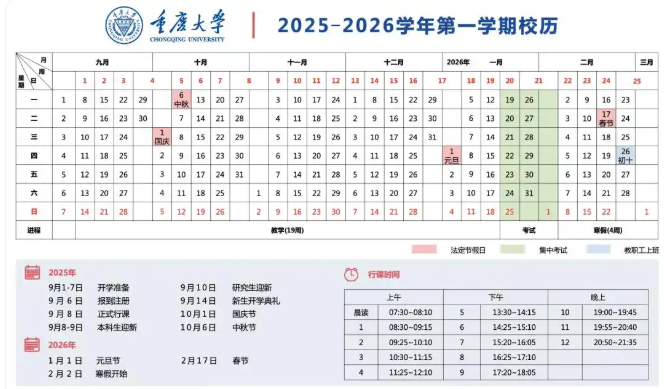 根据官网信息,2025年重庆大学的本科生开学时间是:9月6日入学报到,本科生迎新9月8日-9日;研究生迎新9月10日。新生需携带身份证原件及复印件、录取通知书、一寸照片4张、黑色签字笔等。
