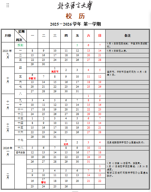 2025北京语言大学校历如下: