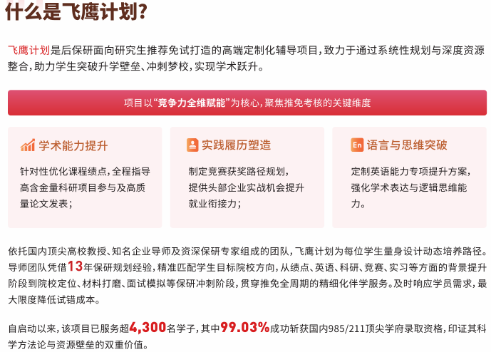| 飞鹰计划Ultra | 保研全程辅导 | 大一、大二、大三 | 定向冲击清北TOP梦校,名校教授亲授,全面背景提升 | 250000 |