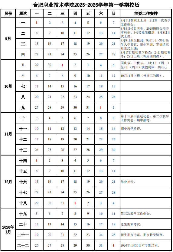合肥职业技术学院寒假放假时间:预计2026年1月1日至2月27日。